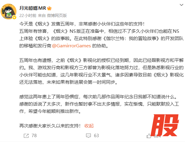 2 月 4 日,月光蟑螂制作的中式恐怖解谜游戏《烟火》迎来发售五周年,宣布改编影视企划中止,NS 版开发中,预计年后发售。