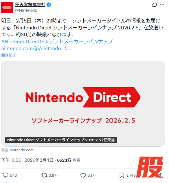任天堂将于北京时间 2 月 5 日晚 10 点举行今年第一期合作伙伴直面会,时长约 30 分钟,重点介绍第三方厂商的游戏。